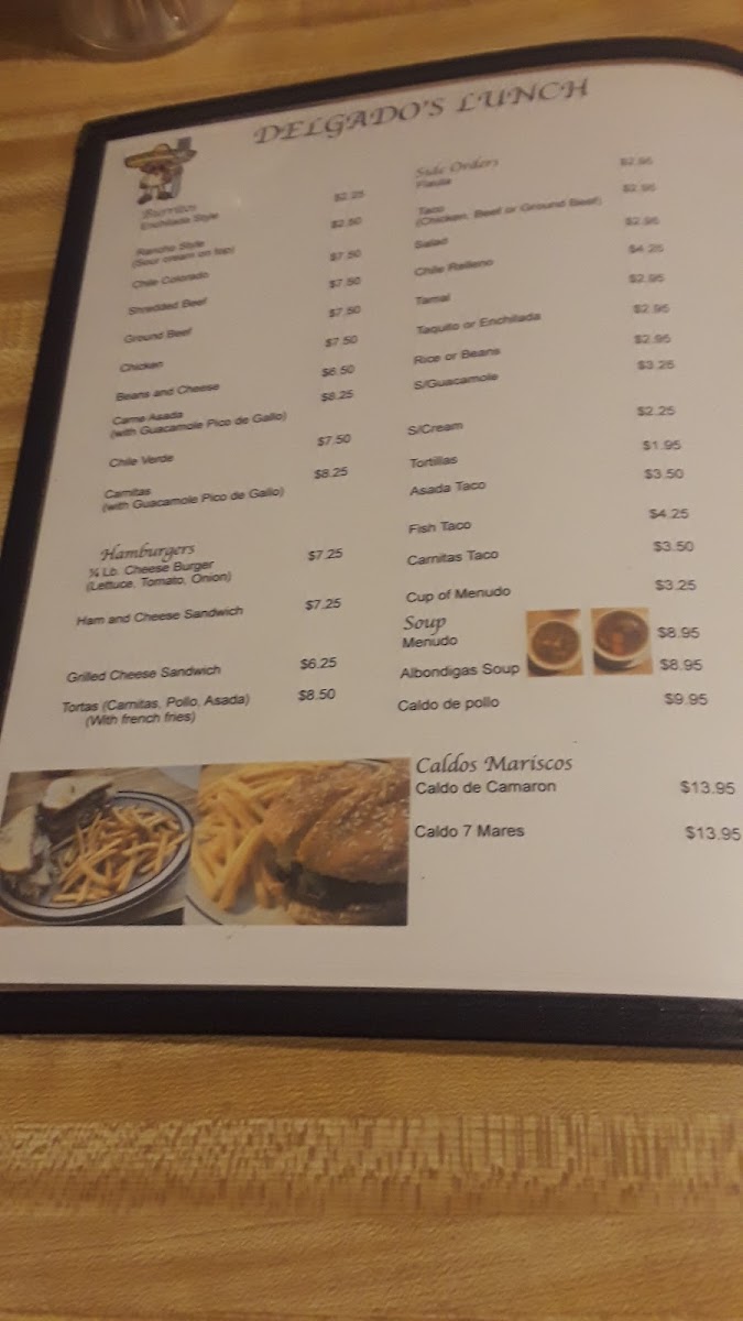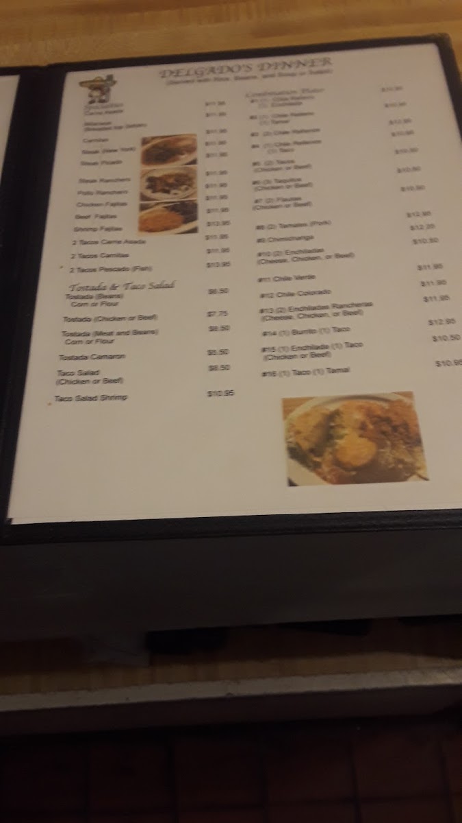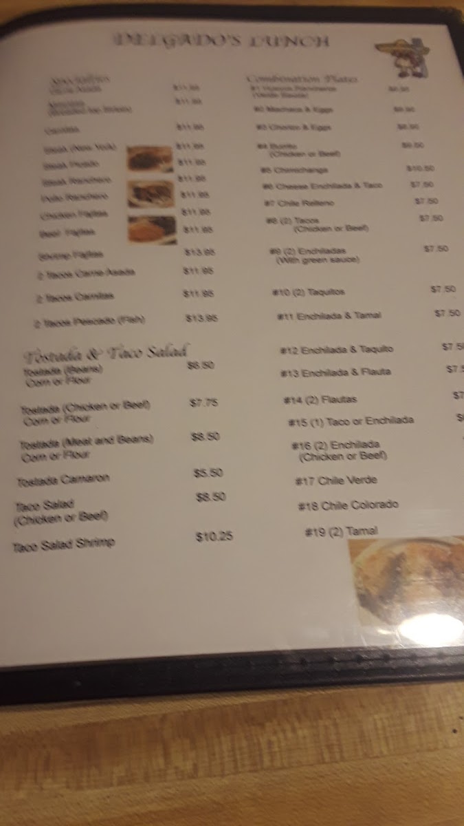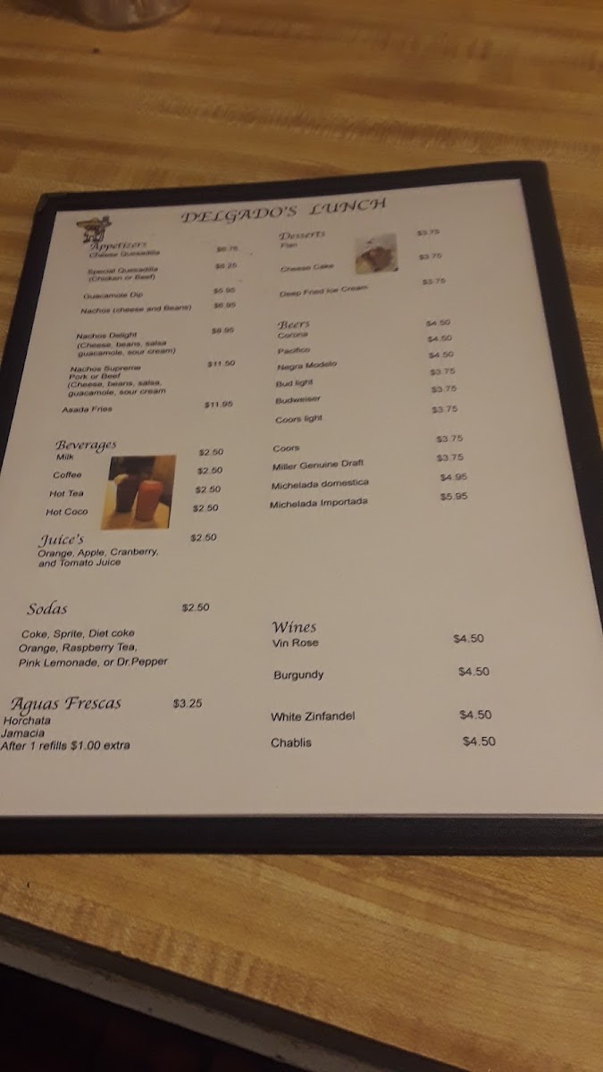 The menu at Delgado's Restaurant offers a variety of traditional Mexican dishes along with a selection of beverages. It is structured to provide a range of options for appetizers, main specialties, and drinks, catering to diverse dining preferences.