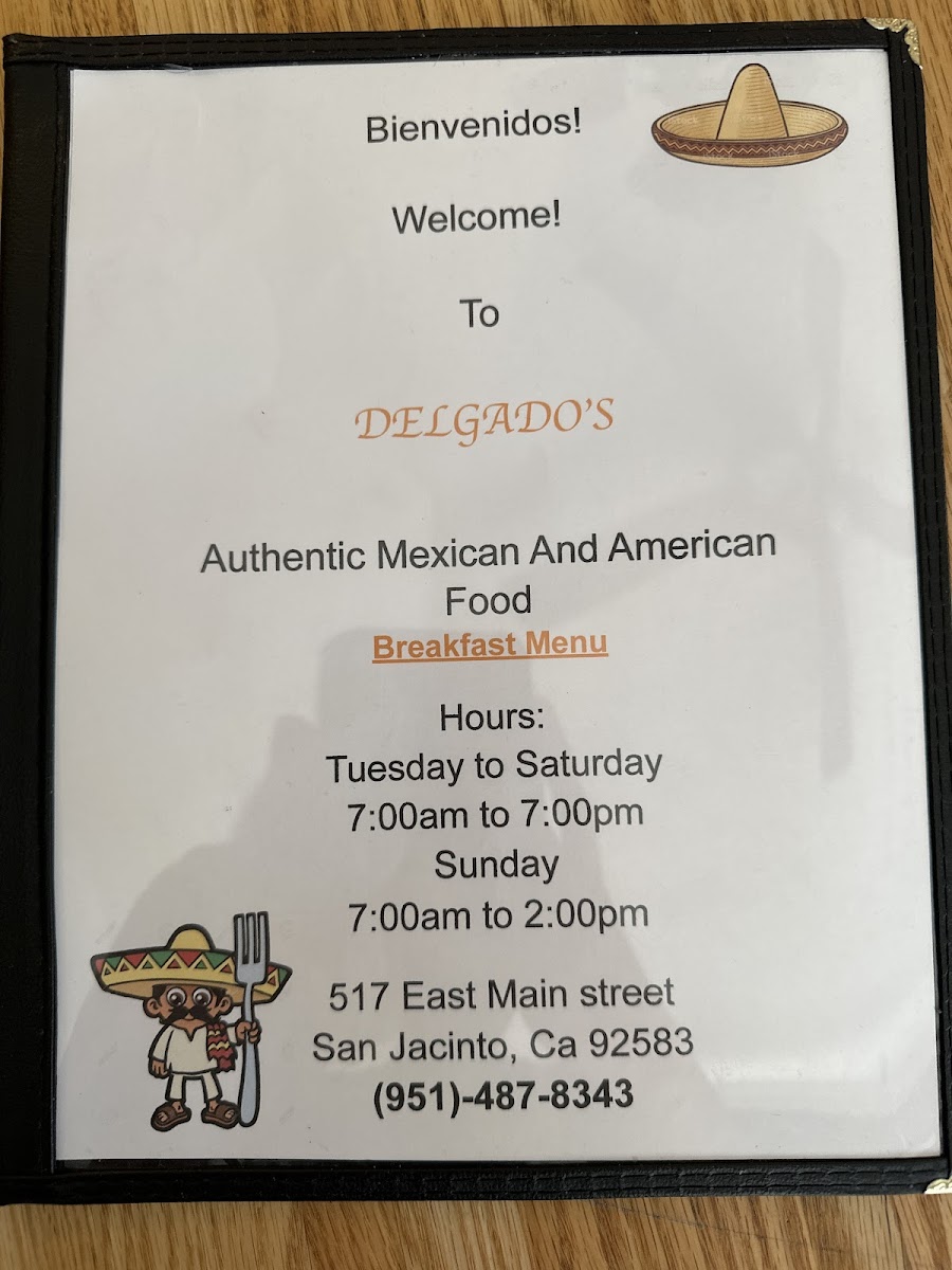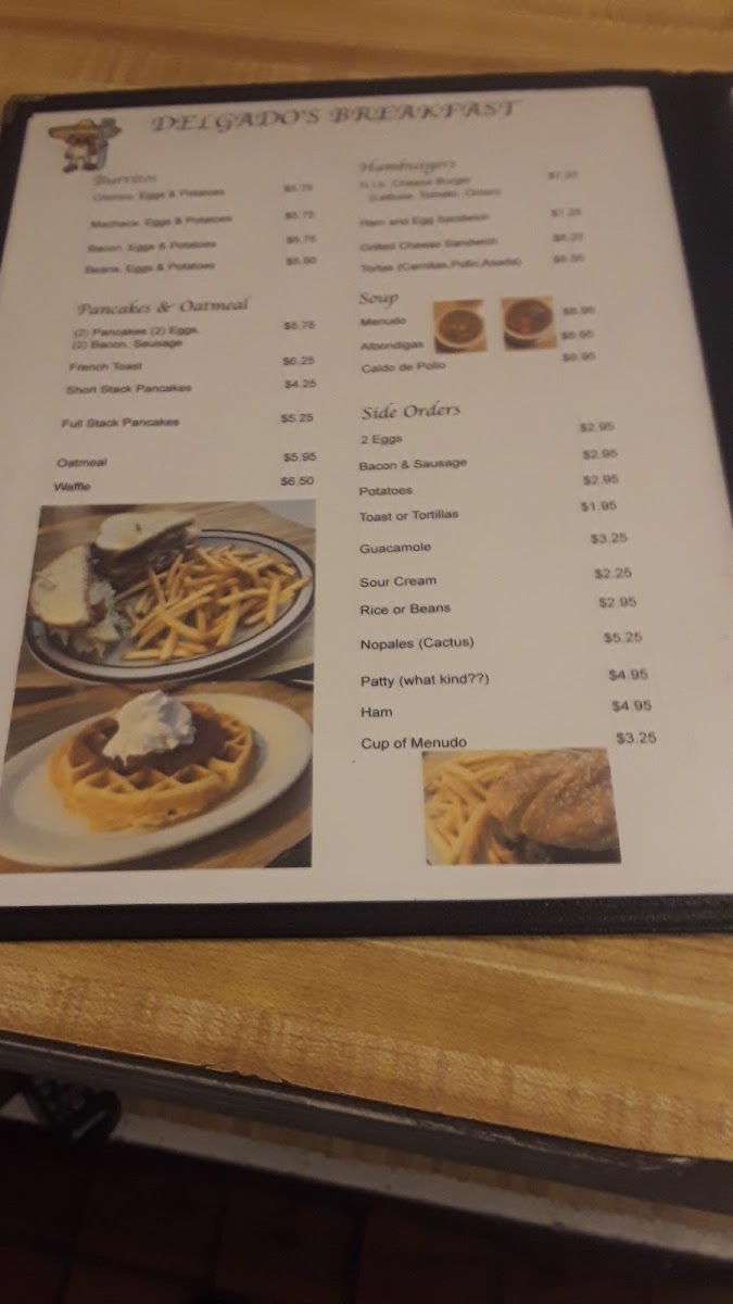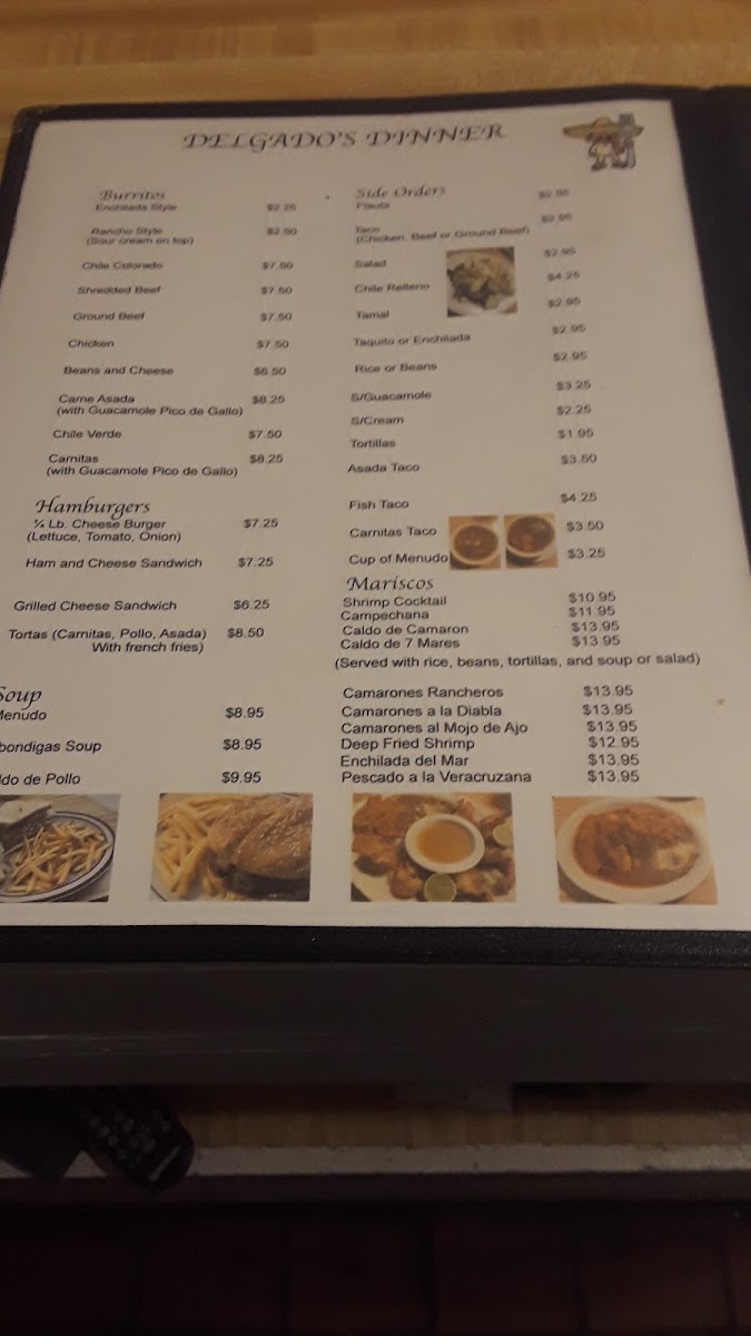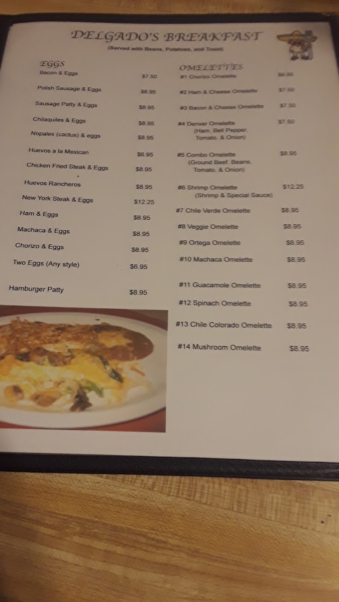 The menu at Delgado's Restaurant offers a variety of traditional Mexican dishes along with a selection of beverages. It is structured to provide a range of options for appetizers, main specialties, and drinks, catering to diverse dining preferences.